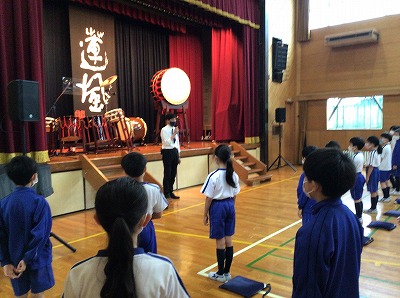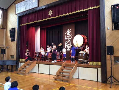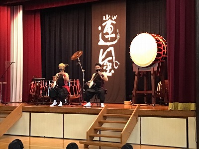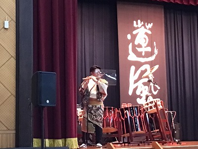 “尺八&桶胴太鼓&長胴太鼓”のコラボ演奏による、斎太郎節(さいたろぶし・宮城県民謡)や沖縄音楽のオープニング演奏で、体育館の空気が和らいだところで、静かに低く和太鼓のリズムに切り替わり、メンバーの紹介やニックネームを知らせていただきました。