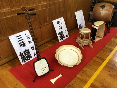 体育館の後方には、楽器の展示コーナーが用意され、“太竿(ふとざお)三味線・津軽三味線”の実物や、長胴太鼓の“皮”部分や“胴の内部”が分かる展示物が並んでいました。