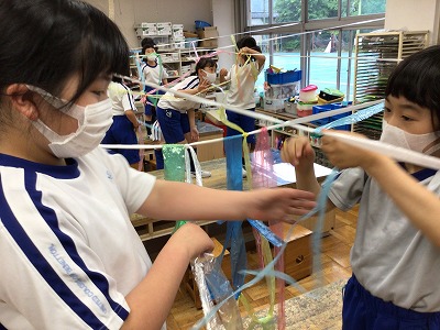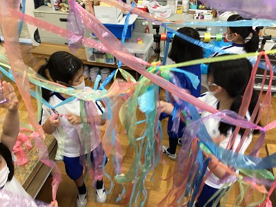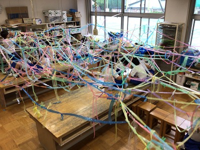 今日の図工は、3年生で協力して、造形室をすずらんテープでジャングルにしていきます!