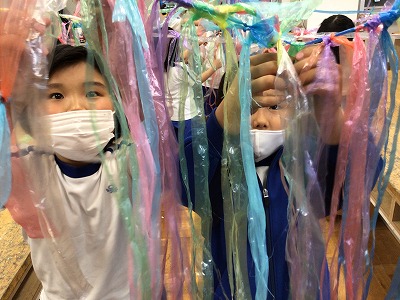 ひらひらとゆれる色とりどりのテープ同士を結び繋げていきます。