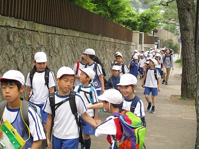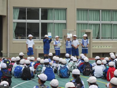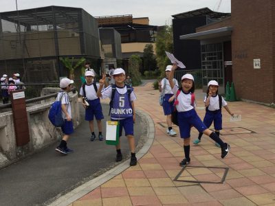 今日のウキウキウォーキングは、雨の予報のため、スタート時刻を早めて、9時前に運動場に集合しました。