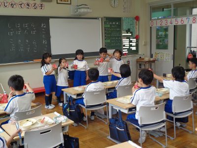 給食の時間には、早速2つの係が、みんなの前に立って活動しました。