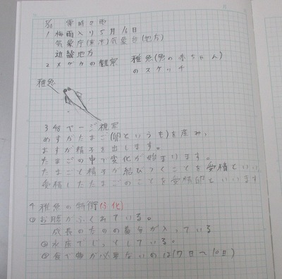 次に孵化したばかりのメダカを見て、稚魚の体の特徴を調べました。