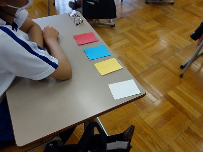 児童は、会の中での質問に対して選択肢に示された色カードを掲げることで、自分の意思を表します。司会進行は全児童が掲げたカードの色を見ながら「赤の○○が多いようです。では、その点について意見を聞いていきます。」といった具合に全校児童の実態から臨機応変に進行していきます。そのカードも、それぞれの児童の机上で準備万端でした。