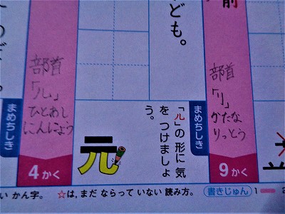・「元」のかん字の2画目は、上より長く書きましょう。