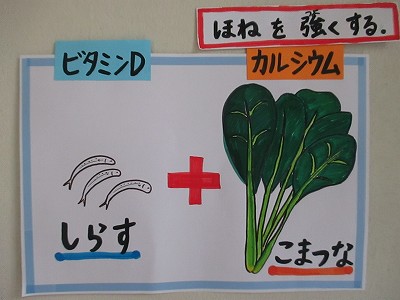 小松菜としらすは、食べ合わせが よく「しらすのビタミンD」が「小松菜のカルシウム」をたすける やくわりを してくれます。カルシウムは じょうぶな ほねを作るのに 欠かせない「えいようそ」です。ぜひ せっきょくてきに、食べましょう!