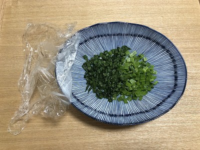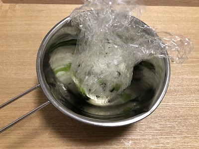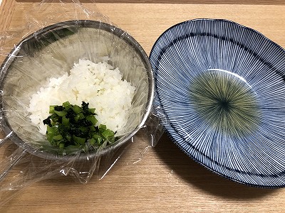 ⑤電子レンジから 小松菜を とりだし、ラップをとります。
