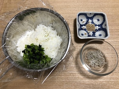 ⑦④のごはんに、「小松菜・しらす・ごま」を入れて よくまぜます。