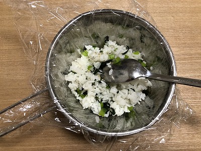 ⑧ラップのはしを よせあつめ、ごはんを おにぎりに しましょう。