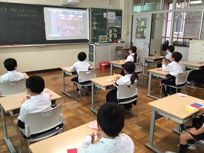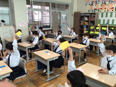 文教キッズ全員の集会「児童会総会」。1年生は、はじめてですが、事前に4色カードを使う練習をするなどして、総会に臨みました。