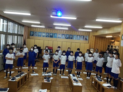 5時間目には、「和」の部屋に各学年の学級代表が集まり、各教室とはリモートでつないで、児童会総会が実施されました。