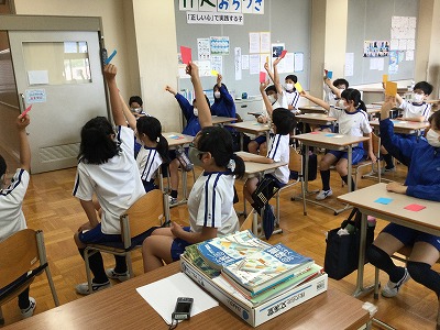 5年生の学級代表、クラスで意見を伝える5年生ともに、本部プランニングからの問いかけに対して、自分の考えをしっかりと全校に発信することができました。