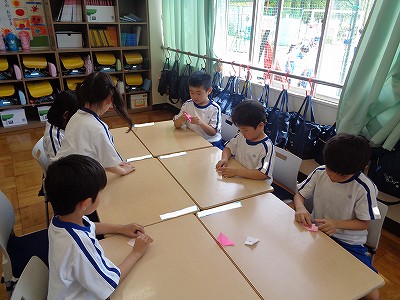 「かざり係」さんは、折り紙で「あじさい」を作る練習をしていました。