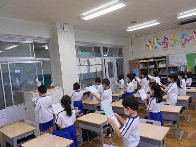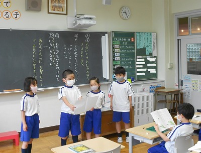 やさしい声で読んだり、リズムを意識して読んだりしながら、みんなで声をそろえて練習しました。