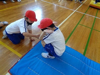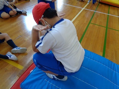 手のひらは耳の横に、あごは首につけて目線はおへそが後転のスタートです。