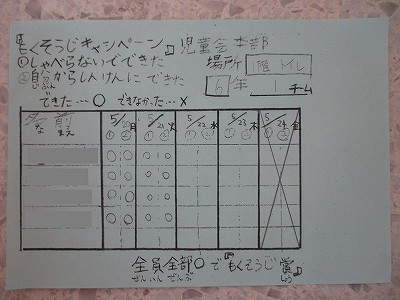 本部メンバーが作成した「キャンペーン台紙」に、全校児童が毎日の掃除を振り返って、反省を書きます。
