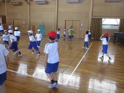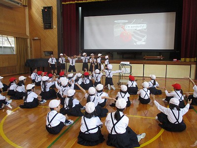 いつものように「英語deだるまさんがころんだ」の実施です。動きが止まった皆のポーズが、おかしくて、思わずふき出しそうになります。