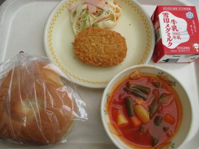 今日の献立は「バターパン、牛肉コロッケ、米粉スパゲティ、ミネストローネ」でした。