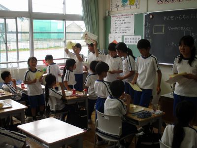 給食時間に、委員達が選んだ作品と、表彰状を各教室に持っていきました。