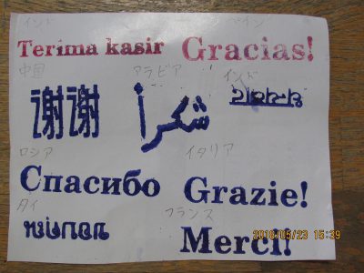 カウンターで、いろいろな文字で書かれた「ありがとう」の印を押しました。