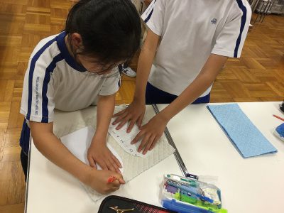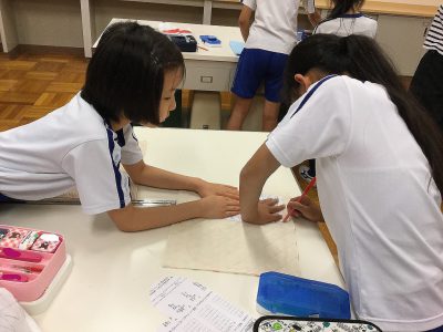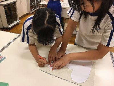 こちらは、6年生のお姉さんと4年生で、布に鍋つかみの型紙を置いて、元布を裁断しているところです。