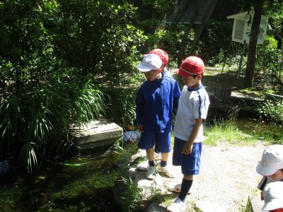 生活科の学習では、観察名人になるために、前半はビオトープの植物や生き物に触れました。
