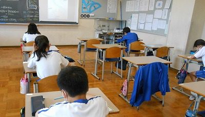 次は、実際の大きさから1000分の1の縮図を作図する練習を行いました。辺の長さを計算して、角度に気をつけながら作図します。㎝をmの単位に直したり、㎞に変える際に計算を間違えないように注意しながら問題を解きました。