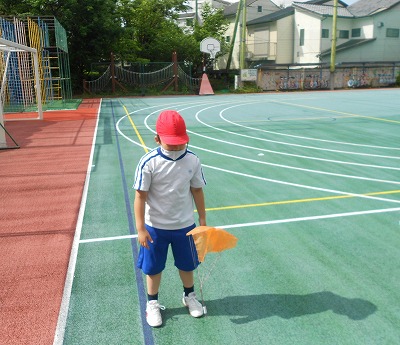 根っこマラソンをした後、昨日作った「落下傘(パラシュート)」で遊びました。