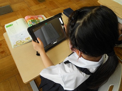 6校時の国語は、2校時に書いたノートを写真に撮り、みんなが考えた文をタブレットで共有しました。