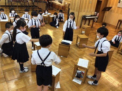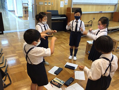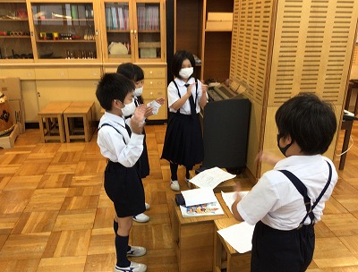 そのほか、「楽器の仲間」や「宇宙の仲間」というのも登場しました。同じ題材でも、お隣さんとは少し違う言葉選びに力を注ぎ、「タンタン・・/タンタン・・」の拍に合わせ、途切れることなく言葉のリレーを完成していました。