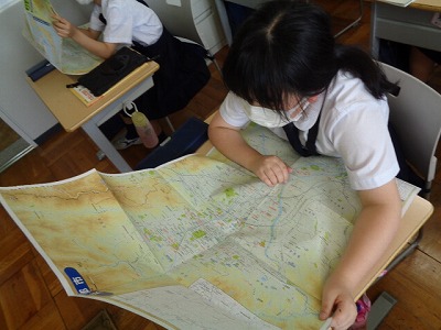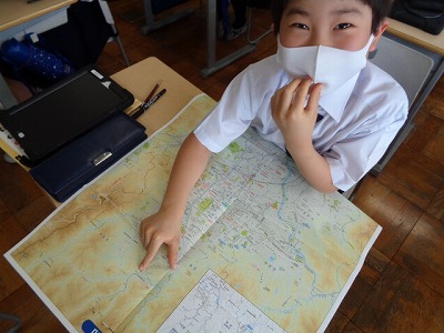 今日は、京都市の大きな地図から、土地や建物の様子、人々の様子などを調べる活動をしました。