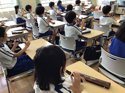音楽室で、“シ”の指使いを知らせ、「トゥトゥトゥ・」や「トゥトゥトゥトゥ・」などの、リズムを発声した後は、教室での音出し練習を行いました。短い時間での練習ですが、「よい音はよい姿勢から!」を合い言葉に、やさしい“シ”の音練習です。