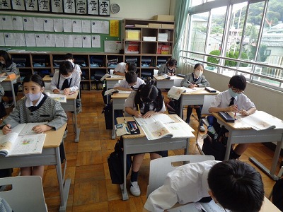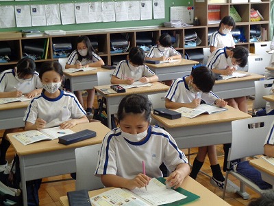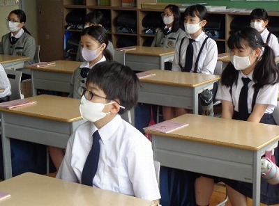 水曜日の朝は、放送礼拝からのスタートです。朝の準備から、静かに過ごしています。昨日が創立記念日であった事から、学園で大切にしている「共生」や「利他の心」についてのお話がありました。また、先週の児童会総会の内容について、自分はその後、どのように変わることができたのか振り返りました。4年生は、無言右側歩行に課題があるようでしたが、どれくらい「本気」で直すことができていたか、自分を見つめ直します。