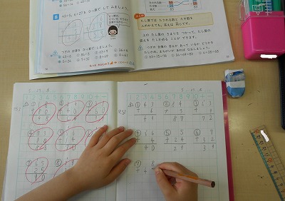 「位をそろえてかく」「一の位から計算する」などをポイントにして、教科書の問題をノートに写して計算練習をしています。
