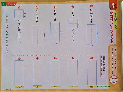 4、5ページの「テストのれんしゅう1」「プレテスト1」を書き進めましょう。