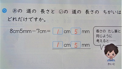 では、「あの道」と「いの道」の長さのちがいをたしかめましょう。