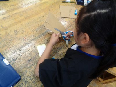 段ボールは、子どもたちにとって堅くて、上手く切るにはコツがあります。