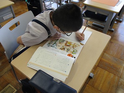 2校時は、国語です。『きつつき商売』の読み取りです。