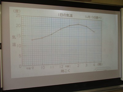これまでに、表や棒グラフを学習済みの4年生。今回は「1日の気温の変化」を折れ線グラフで表した資料を見て、その特徴を考えました。