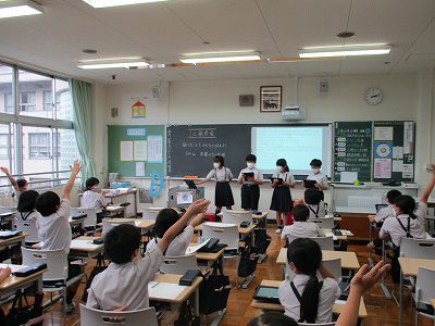 タブレットで自分の考えを入力したり、発言したりしながら話し合い活動を進めています。