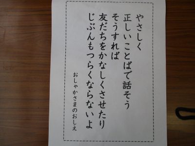 “やさしく正しいことばで話そう。そうすれば、友だちをかなしくさせたり、自分もつらくならないよ。(おしゃかさまの教え)”