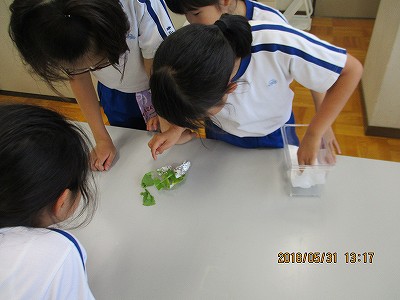 3年生は、グループに一つ、育てているモンシロチョウの幼虫の様子を見に来ました。