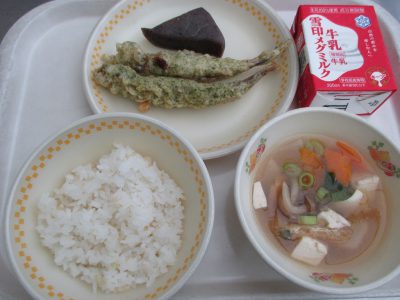 今日の献立は「子持ちししゃもの天ぷら、こんにゃくの煮物、けんちん汁」でした。