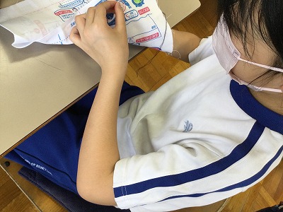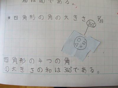 三角形と同じく、四角形の4つの角を切り取り、1つの点に集まるように並べたり、四角形を対角線で2つの三角形に分けたりするなどして調べました。