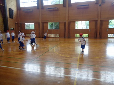 準備体操の後、色々な鬼ごっこをしました。変わり鬼をした後は、線鬼です。鬼になった人が、線の色をみんなに伝えると、みんな一目散にその線の上を逃げます。