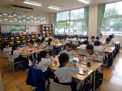 今日は、チームのみんなと机を合わせて、給食の時間を過ごしました。