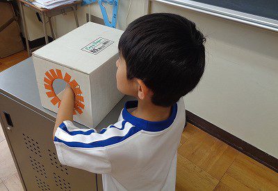 「?ボックス」に手を入れて、形を触りながら「箱の形」か「筒の形」か「ボールの形」かを当てるゲームです。