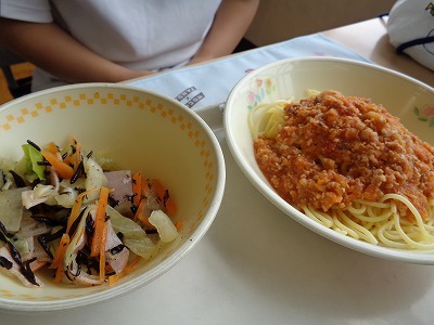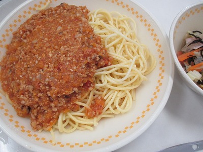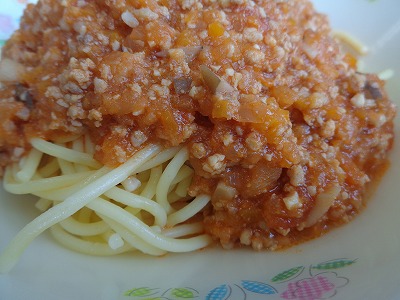 玉ねぎや人参をミキサーにかけ、煮込んで作ったミートソースでいただきました。