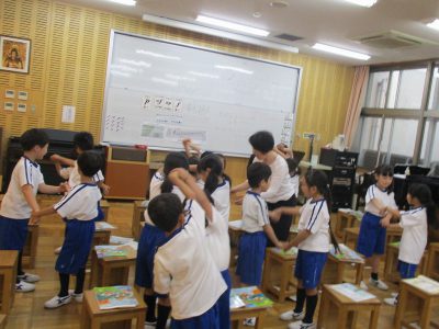 「なべなべ」は、ペアで声と動きを合わせながら楽しく練習しています。