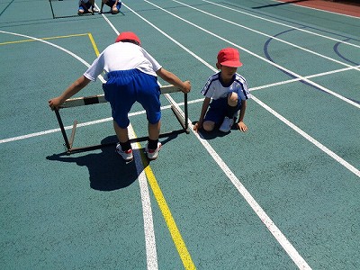 体育の前半は、ハードル走です。自分達でメジャーで間隔をはかって準備しました。